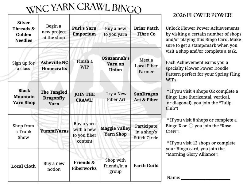 For the joy of adventure, those crawlers who wish to are invited to participate in filling their bingo card or striving to visit as many shops as they can! During the week of the crawl, fill as many bingo squares as you can at the shops you visit, and have your crawl brochure stamped! You can earn a certificate of honor affirming your achievement at certain levels! This year’s affirmation of achievement includes “doodle pack” type colorwork charts of flowers for you to incorporate into a future project!